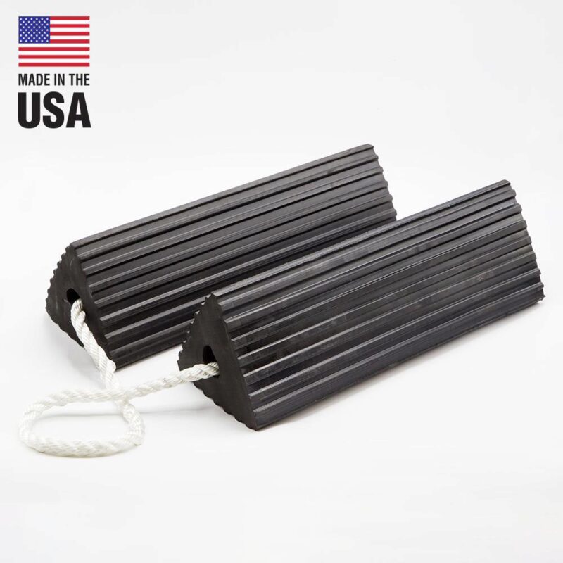 ~Allows either side to be positioned against the tire. ~Replaceable 24 in. polyester rope lanyard. ~Sold as singles with rope or roped together as pairs. ~Available in 10, 12, 15, 18, 21, and 24 inch lengths. ~Length: 12 in. (30.5 cm), Width: 5 in. (12.7 cm), Height: 4.33 in. (11.0 cm), Weight: 7.7 lb. (3.5 kg) per single chock. ~Color: Black, 1 Pair.